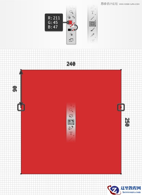 在工具栏中选择矩形工具(快捷键M) 设置描边效果为无,设置填充颜色为R=211 G=45 B=47。 利用矩形工具画一个240x250px的矩形,体会一下网格和对齐网格带来的便捷。