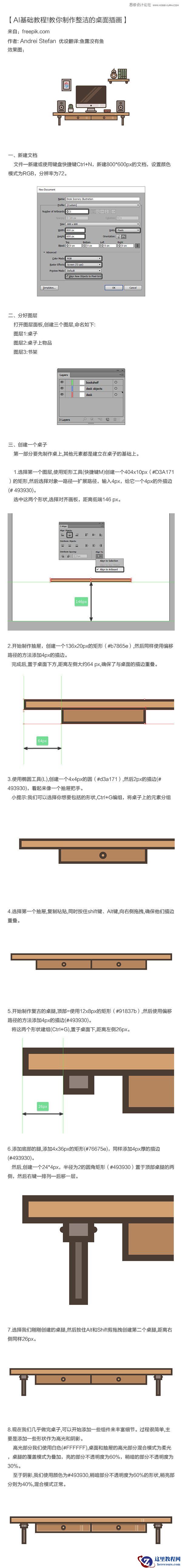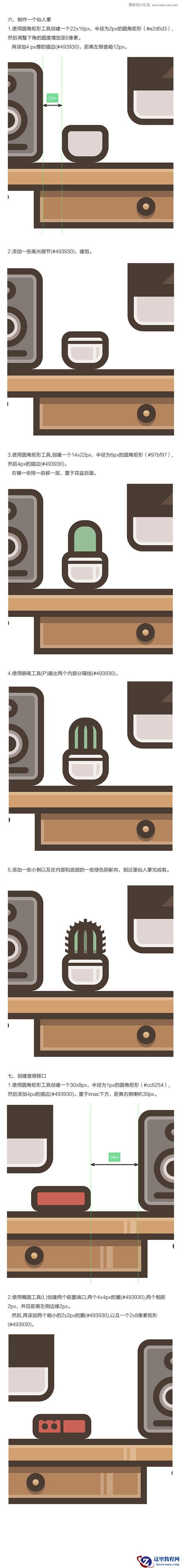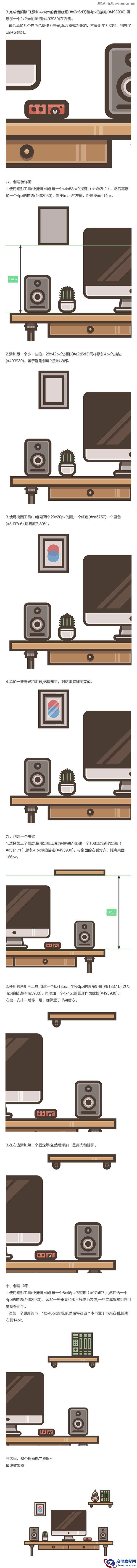 通过这个教程,你可以掌握绘制「书桌、iMac、音箱、仙人掌、书籍」等常用物品的方法,建议新手多练习这类教程,久而久之就能把复杂的效果拆分出来临摹了。