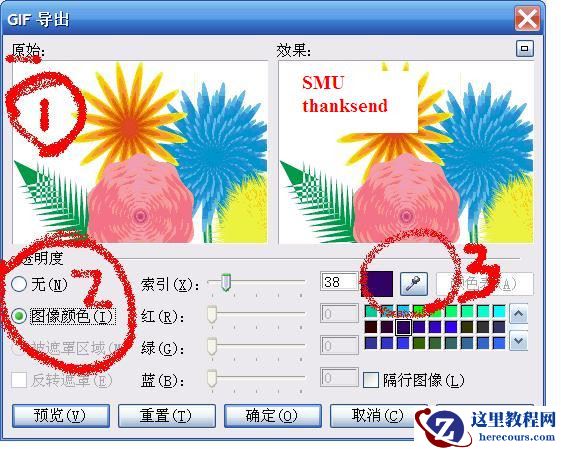 在”2“处选择图像颜色单选框,接着在”3“处单击吸管工具,最后在”1”处吸取你的作品中的背景颜色