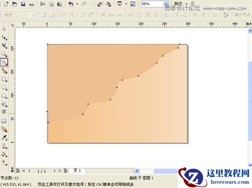 3、选择工具箱中的贝塞尔工具 ,在场景中绘制出无规则的形状,结合形状工具 ,调整节点。然后双击状态栏中的填充色彩图标,设置填充颜色为土黄色,颜色CMYK值分别:4、22、36、0,如图3所示。