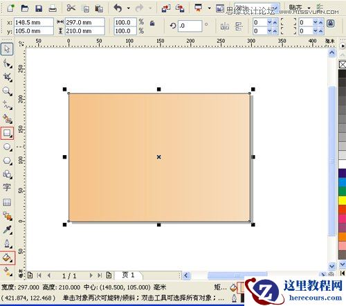 2、双击工具箱中的矩形工具 ,建立一个与画布完全相等大小的矩形,点击颜料桶工具 选择对话框渐变式交互填充工具 (快捷键F11),弹出渐变填充对话框,设置类型为:线性;角度:0度;边界:0%;颜色调和:双色,设置由土黄色渐变到淡黄色的线性效果,如图2所示。