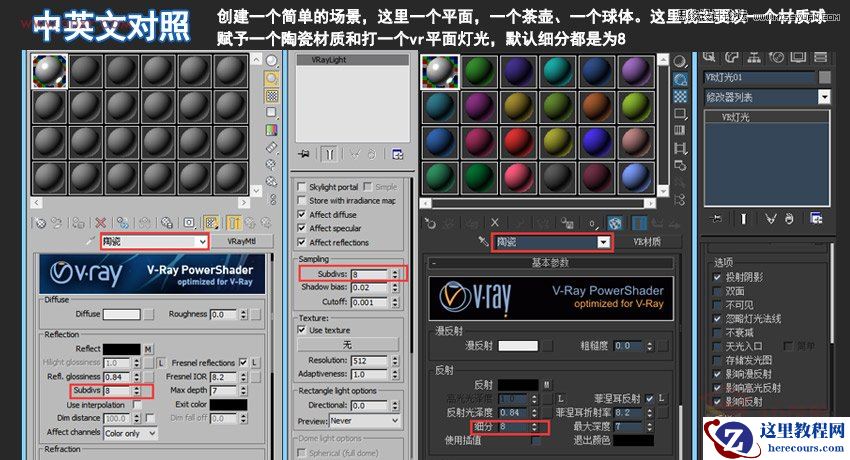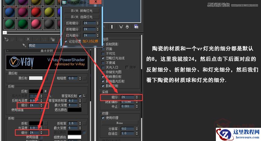 这里,之前我一个陶瓷的材质和一个vr灯光的细分都是默认的8,这里我就按24,然后点击下后面对应的反射细分、折射细分、和灯光细分,然后我们看下陶瓷的材质球和灯光的细分。