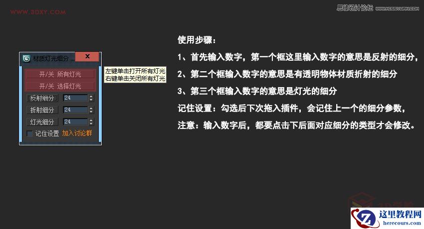 好了,由于平时我们经常遇到一个场景有很多材质及灯光,所以这在室内设计方面是很实用的,也就是说材质的反射和折射的细分和灯光的细分批量进行了修改,哈哈,是不是很方便?感谢大家的观看,希望能提高一下大家的实用小技巧。最后再啰嗦一句,用的时候看到插件里面的小黄字了吗?