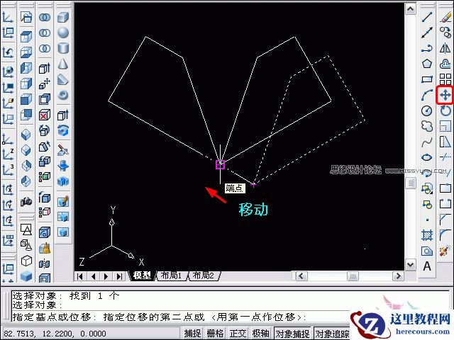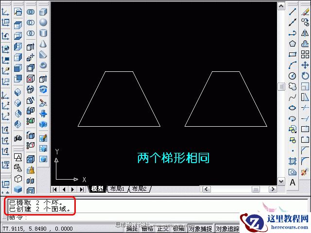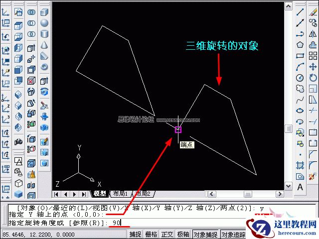 4、点击选中要进行三维旋转的右边的梯形,定义旋转轴时输入“Y”;指定Y轴上的一点,如图指定一个端点;旋转角度为90度。