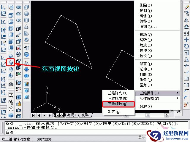 3、先点击“东南视图”按钮,进入到东南视图界面。再点击下拉菜单的“修改”→“三维操作”→“三维旋转”。